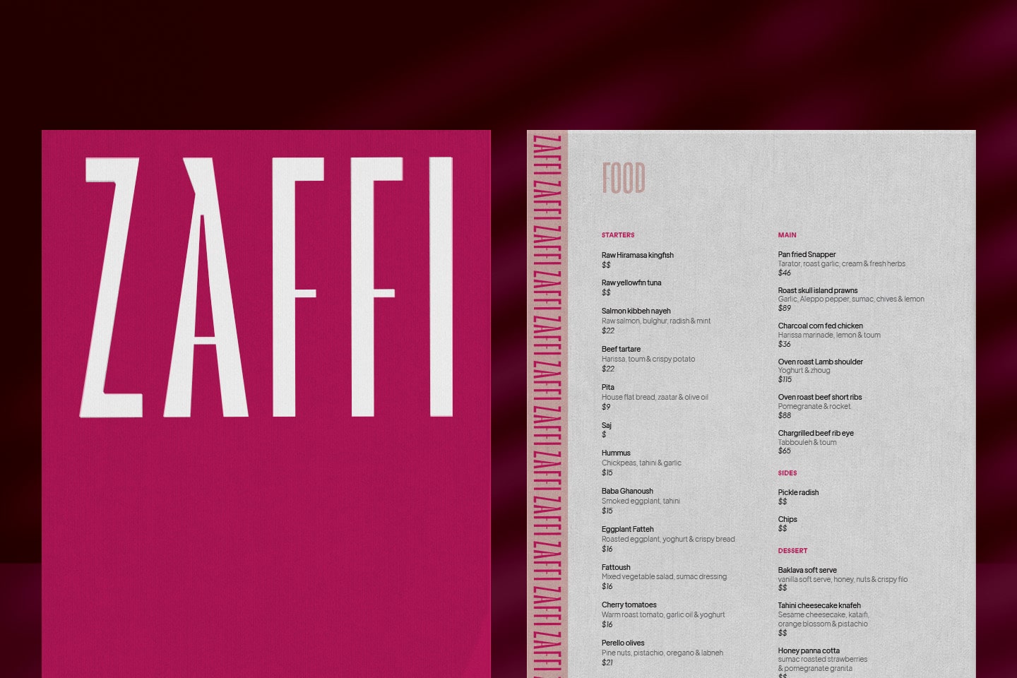 Tying the restaurant and bar together is a strong Middle Eastern influence from venue owner Chady Khouzame and ex-Rockpool and Chin Chin chef, Graeme Hunt. During our brand research phase, we became enthralled by the vibrancy of Lebanese culture, noticing movement in the Baladi dance, food sharing and contagious interactions. This was a larger than life influence we couldn’t resist. Layering light and motion we designed a brand with dimension that bounces off the walls and into the essence of the space, impossible to ignore, easy to escape in. The brand mark also references the shapes in Arabic calligraphy, executed in all caps to forge a bold and confident presence.